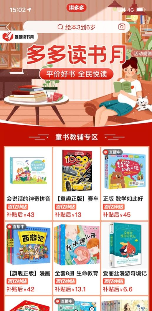 8月30日,多多读书月上线童书教辅专区,读者在拼多多APP搜索“多多读书月”即可直达。