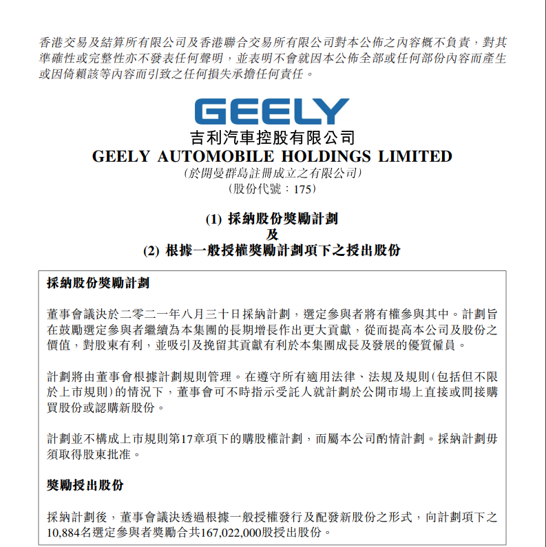 8月30日,吉利汽车(00175.HK)在港交所公告称,吉利汽车董事会通过了一项总额不超过3.5亿股的股份奖励计划,并根据该计划向10884名被激励对象授予约1.67亿股股份。