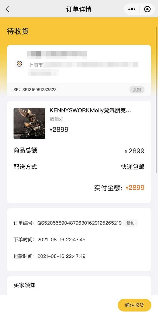 董女士称,8月16日,她通过泡泡玛特官方2021pts展会线上直播购买了一款名为KENNYSWORKMolly蒸汽朋克机车(艺术家版)的商品,该商品价值2899元。8月19日收到快递开箱检查时发现商品存在严重的质量问题,商品部分零部件断裂,并且断裂处有细微胶水痕迹。