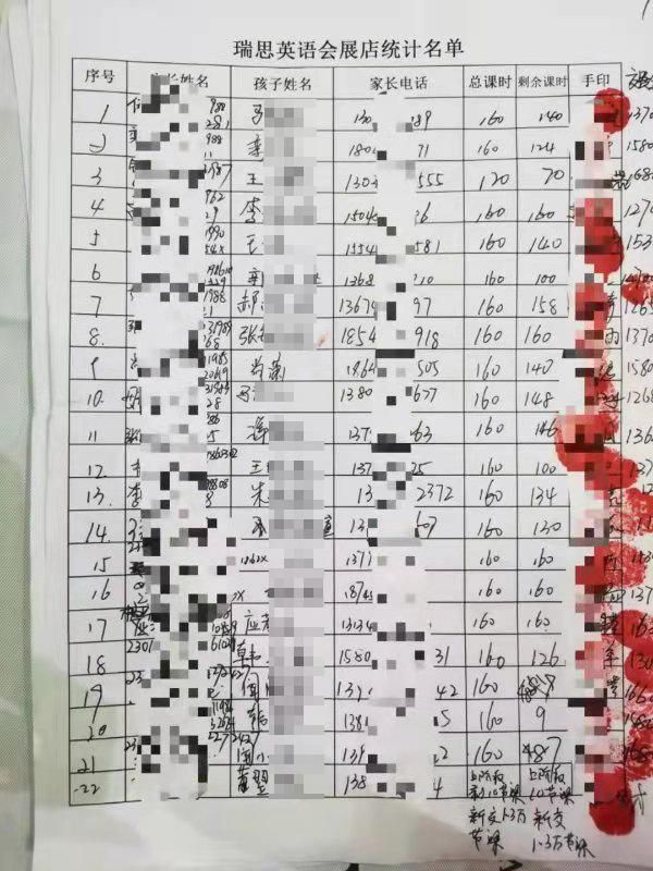 8月25日,刘女士和一些家长来到瑞思英语哈西万达校区和道里兆麟校区,填写了剩余课时和金额等相关信息的登记表。刘女士说:“这些表格可能会交到教育局。有四个校区,群里有些家长交的学费有四五万,也有十多万的。”