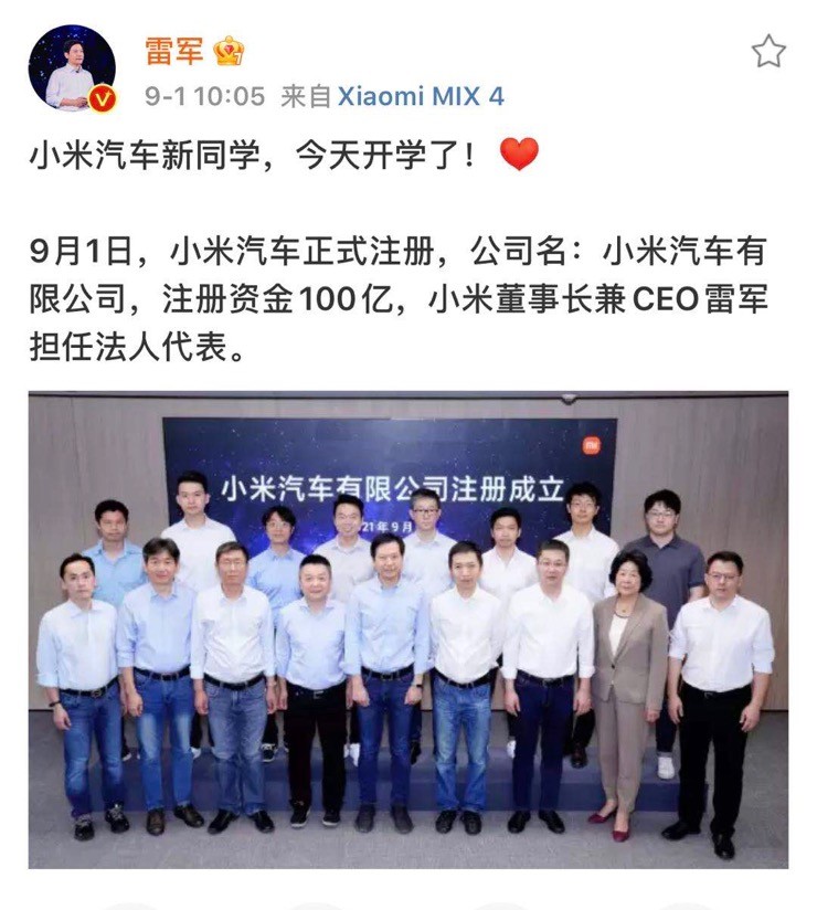 9 月 1 日,雷军在个人微博发文称,小米汽车正式注册,注册资金 100 亿元人民币,小米集团创始人、董事长兼 CEO 雷军亲自出任法人代表。
