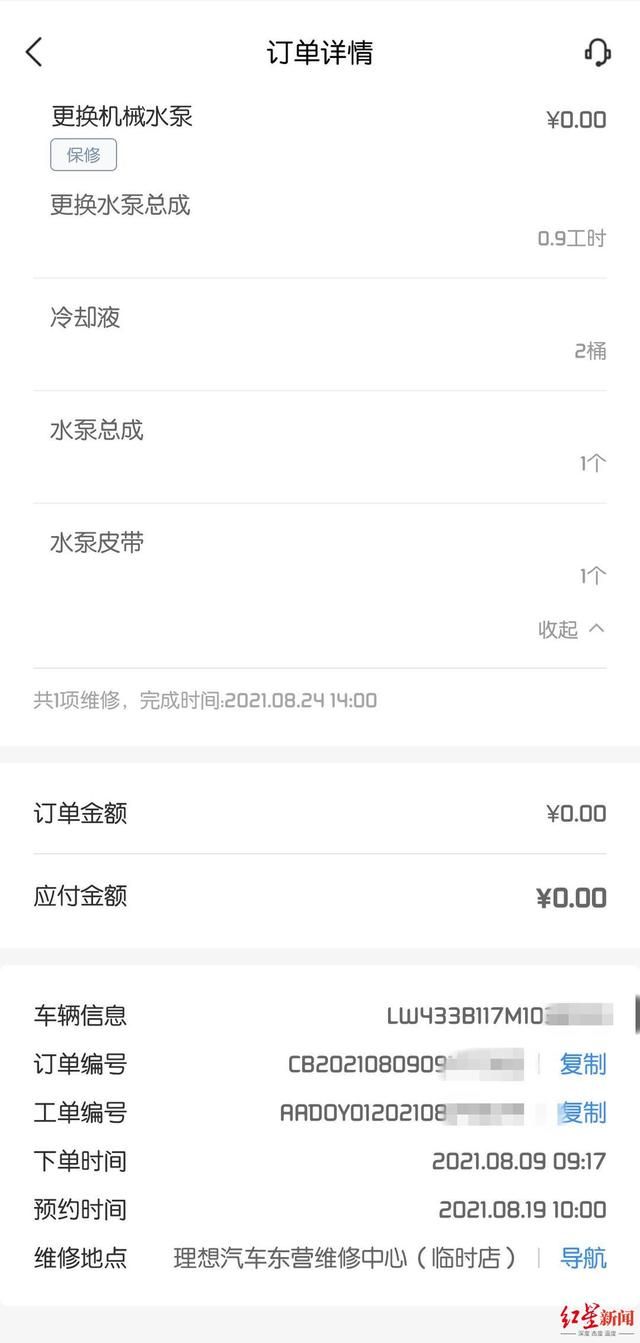 8月13日,韩先生再次使用增程器的时候,中控屏幕出现了“增程器水温过高”的报警提示。韩先生告诉红星资本局,检修师傅过来换了机械水泵,后面可能还会换发动机。尽管如此,理想汽车客服却一直说质量没有问题。