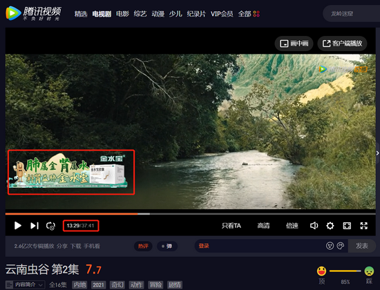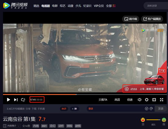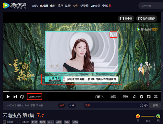以《云南虫谷》为例,该剧由企鹅影视出品、腾讯视频独播,腾讯对于这一自制内容拥有掌控力。这也有助于出品方利用剧中演员,为广告主制作能结合剧中场景的营销广告。