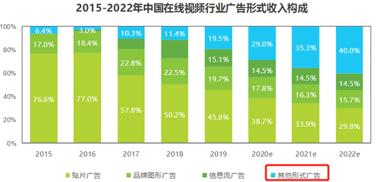 根据艾瑞咨询《2020年中国网络广告市场年度洞察报告》,国内在线视频行业的广告趋势从贴片广告(网络视频播放前、播放暂停或者播放完后插播的图片、视频、FLASH等广告)向其他形式广告转变。预计在今明两年,其他形式广告将在所有广告形式中占主导地位。