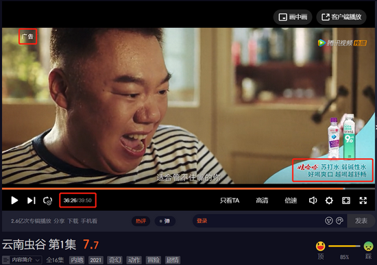 有网友计算,在扣除每集5支嵌入式广告(合计用时约2分30秒),以及片头、片尾,有剧情发展的时长,《云南虫谷》每集内容也就半个小时。这还不包括在剧中的屏幕左下角,偶尔出现的小广告。