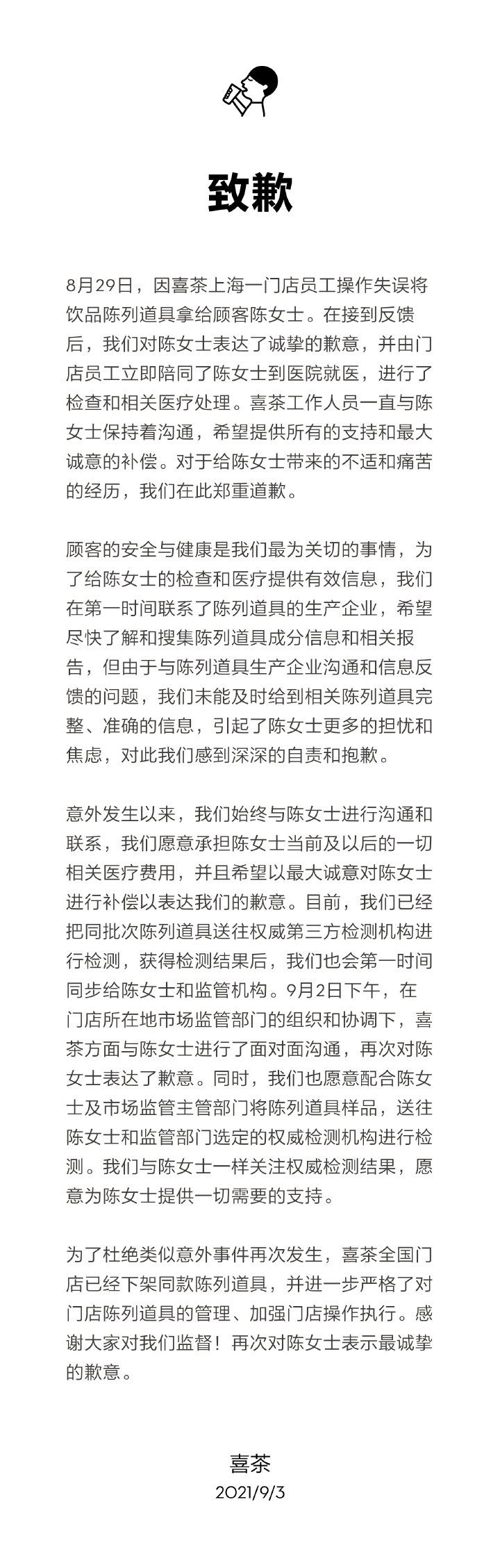 商业 喜茶误将道具当饮品售卖致顾客洗胃:已致歉 2021-09-04 08:56:12 分享 来源:界面新闻9月3日,喜茶发布致歉声明称,8月29日,喜茶上海一门店员工操作失误将饮品陈列道具拿给顾客,门店员工立即陪同陈女士到医院就医,进行了检查和相关医疗处理。喜茶愿意承担陈女士当前及以后的一切相关医疗费用。目前,喜茶已把同批次陈列道具送往权威第三方检测机构进行检测,获得检测结果后,会第一时间同步给陈女士和监管机构。喜茶表示,为杜绝类似意外事件再次发生,喜茶全国门店已经下架同款陈列道具。致歉声明全文如下: