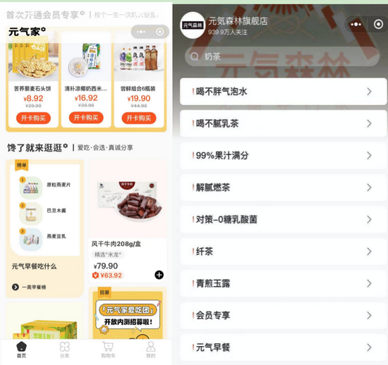 (图注:元气森林在微信小程序开设旗舰店和会员店,旗舰店粉丝达939万。运动饮料产品线“外星人”已单独拆店,“有矿”矿泉水并入外星人旗舰店中,北海牧场成为独立品牌。)