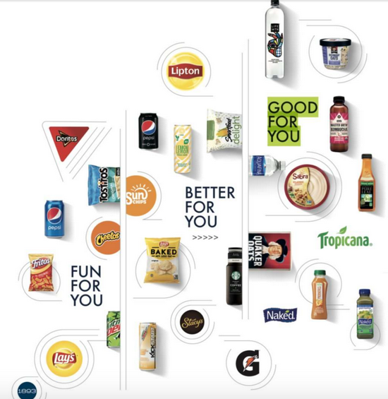 但巨头更早已经看到了这个打法。百事早就横切各种类别的食品与饮料,并一直在向健康方向倾斜。从不健康到健康,其产品线分三大类,一类 Fun for You,包含高油高热量的产品;另一类 Better for You 健康了一些,如零卡可乐;最后一类 Good for you,主打富营养价值的桂格麦片、气泡水和果汁等。根据百事可乐 2017 年的财报显示,2006 年后两类的产品只占 1/3,截至 2017 年底,它们的占比已经达到 50%。