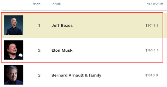 另外,今年以来,马斯克与贝索斯一直在全球富豪榜上也是“你追我赶”,打得火热。今年3月,马斯克的身家一度升至1850亿美元,超越贝佐斯成为全球首富。随后,亚马逊股价一路飙涨,贝索斯身家再度反超马斯克,坐稳全球首富的位置。据福布斯实时数据显示,贝索斯的最新身家为2013亿美元,领先于马斯克的1905亿美元,差距非常微妙。