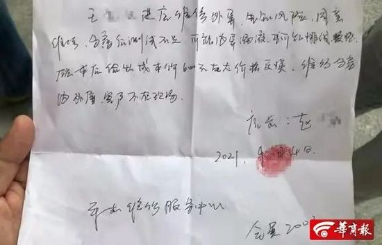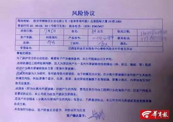 9月5日下午,华商报记者在王先生提供的手写“说明”上看到:9月4日,王先生进店维修外屏,告知风险,同意维修。分离后测试不足,可能内屏漏液,多可能排线受损,故本店给出成本价600元左右价格更换,维修分离内外屏,客户不在现场。下方注有“手机维修服务中心”“会展2003”等字样。落款为店长赵某,按有手印。