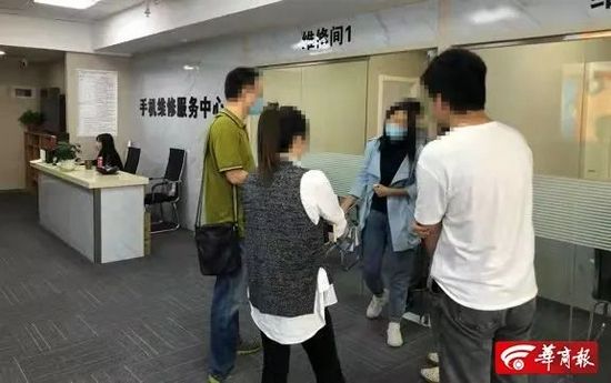 5日下午2时许,华商报记者陪同王先生来到会展国际大厦2003室,门头为“手机维修服务中心”,表明来意后,工作人员称负责人在“维修间1”内。刚进入“维修间1”,就有一位市民提醒,“不要在这里修手机,有问题。”