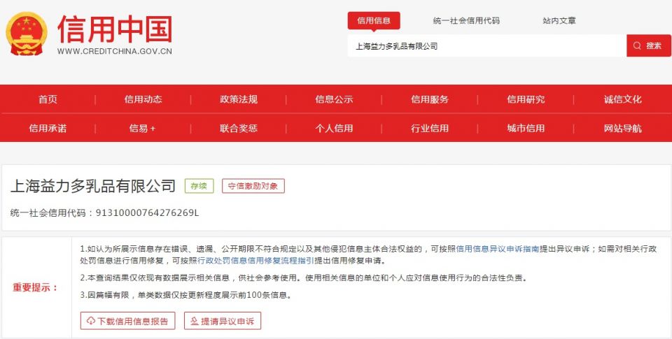 信用中国公示的信息显示,上海益力多乳品有限公司成立于2004年8月10日,法定代表人为平野晋。