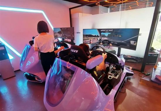 △“派学车”灵石路的一处VR室内教学点内,学员正在模拟器上学车。