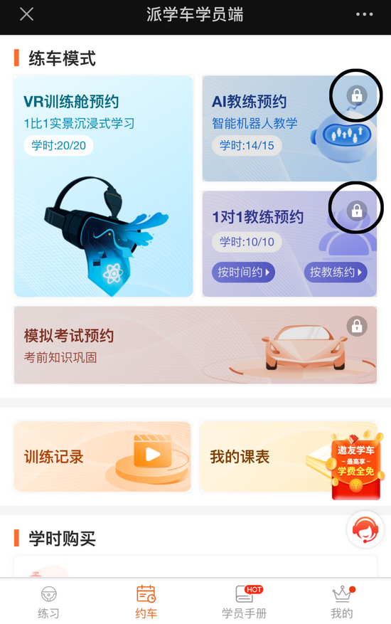 △李女士发现,她的“派学车”小程序界面上教练预约模块已被锁定,只能选择新出现的20个学时的“VR训练舱预约”。