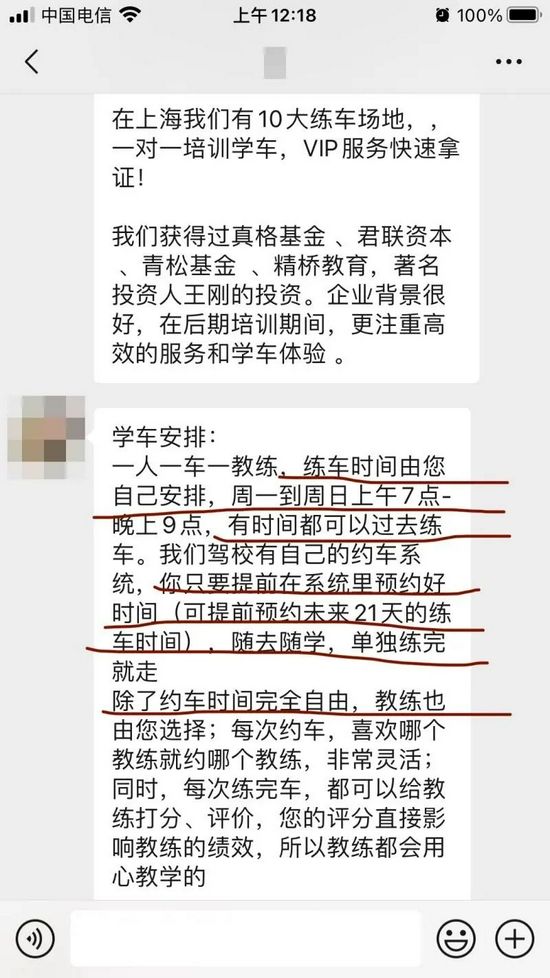 △教学顾问向陈女士承诺:“10大练车场地”“一人一车一教练”“练车时间自由,提前21天预约”。