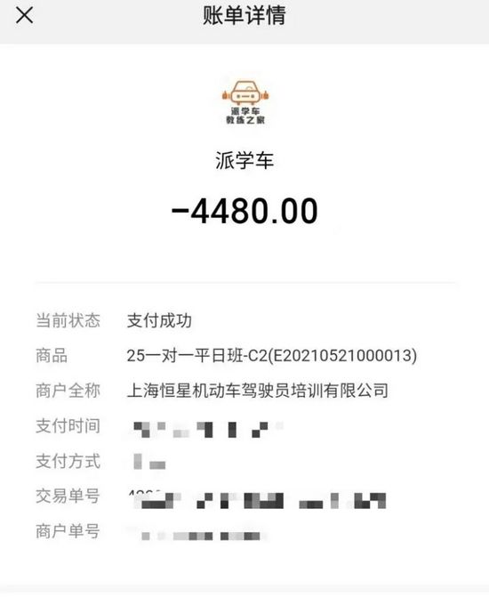 △周女士在“派学车”平台为孩子报名了4480元的驾培课程,图为付款记录。
