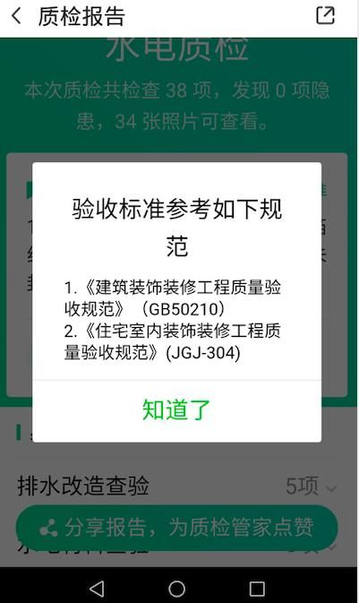 红星资本局发现,土巴兔提供给付先生的质检报告中,注明是参考了《建筑装饰装修工程质量验收规范》和《住宅室内装饰装修工程质量验收规范》。