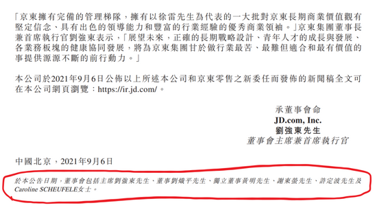 “于本公告日期,董事会包括主席刘强东先生、董事刘炽平先生、独立董事黄明先生、谢东萤先生、许定波先生及Caroline SCHEUFELE女士。”将这份宣布徐雷升任的《京东集团和京东零售的新委任》拉到最后,小字号、斜体写着这项备注。