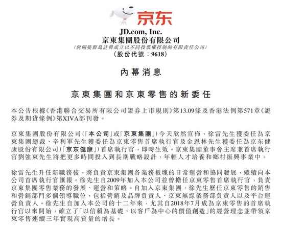 9月6日,京东集团在港交所发布了公告。公告称,京东零售首席执行官徐雷获委任为京东集团总裁,辛利军接任徐雷,获委任为京东零售集团首席执行官,金恩林获委任为京东健康首席执行官,即时生效。