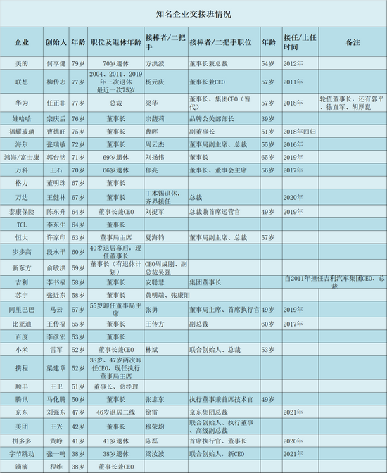 公开信息中没有写明徐雷的具体年龄,但从履历和外表看起来,两人年龄相差并不大。盒饭财经(ID:daxiongfan)就美的、联想、华为、娃哈哈、福耀玻璃、海尔、万科、腾讯、京东、小米、百度、拼多多、阿里等知名企业交接班的情况作了统计。统计的情况包括创始人年龄、退休年龄、二把手或接棒者年龄、职位等。