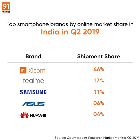 据91mobiles报道,Counterpoint Research数据显示,在2019年第二季度的印度线上手机市场占有率,小米、realme、三星位列前三。