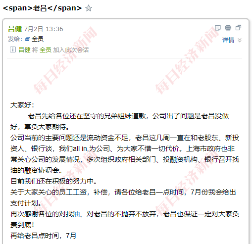 在6月17日发送给全体员工的一封邮件中,吕健称:“目前老股东和新投资人都在积极和我们沟通中,如果月底前不能有新的资金注入,公司将会面临停摆。老吕会承担所有责任和义务。请大家尽可能做好本职工作。”