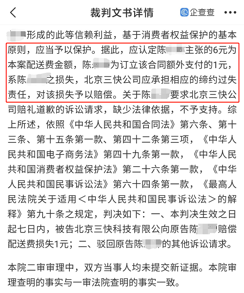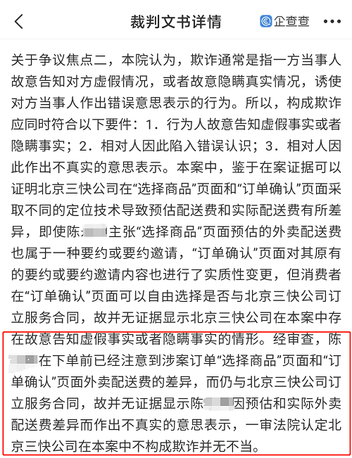 法院认为,一审法院认定北京三快公司在本案中不构成欺诈并无不当;应认定陈某主张的6元为本案配送费金额,陈某为订立该合同额外支付的1元,系陈某之损失,北京三快公司应承担相应的缔约过失责任,对该损失予以赔偿。