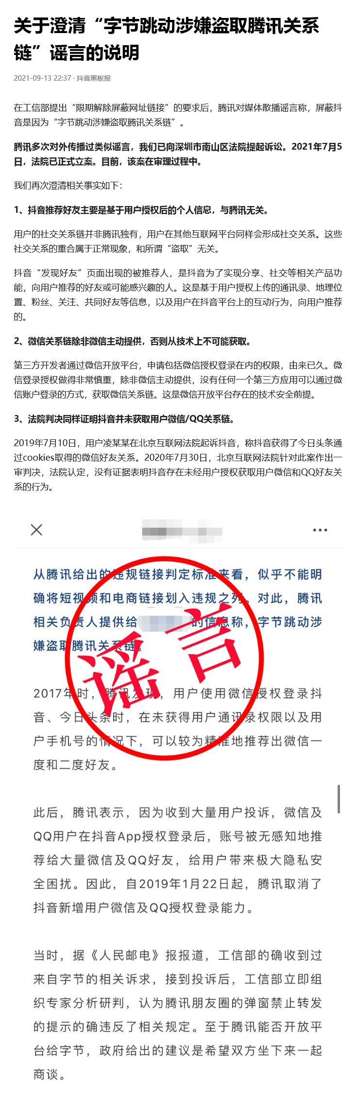 商业 抖音回应“涉嫌盗取腾讯关系链”:腾讯多次传播类似谣言 2021-09-15 08:13:13 分享 来源:观察者网9月13日晚间,抖音通过头条号“抖音黑板报”发布声明称,“字节跳动涉嫌盗取腾讯关系链”系谣言,法院已正式立案。抖音称:“腾讯多次对外传播过类似谣言,我们已向深圳市南山区法院提起诉讼。2021 年 7 月 5 日,法院已正式立案。目前,该案在审理过程中”。抖音在声明中就“涉嫌盗取腾讯关系链”传闻表示:一、抖音推荐好友主要是基于用户授权后的个人信息,与腾讯无关;二、微信关系链除非微信主动提供,否则从技术上不可能获取;三,法院判决同样证明抖音并未获取用户微信/QQ 关系链。