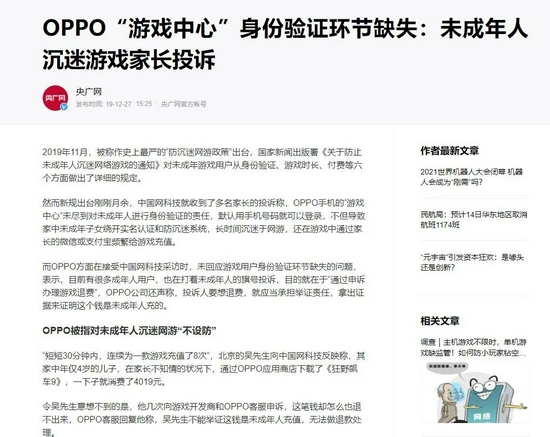 除了vivo,华为、小米手机、vivo兄弟品牌OPPO也被频频曝出存在类似问题。2019年,中国网科技报道称,OPPO手机“游戏中心”未尽到对未成年人进行身份验证责任,默认用手机号码就可以登录,导致家中未成年子女绕开实名认证和防沉迷系统,频繁给游戏充值。