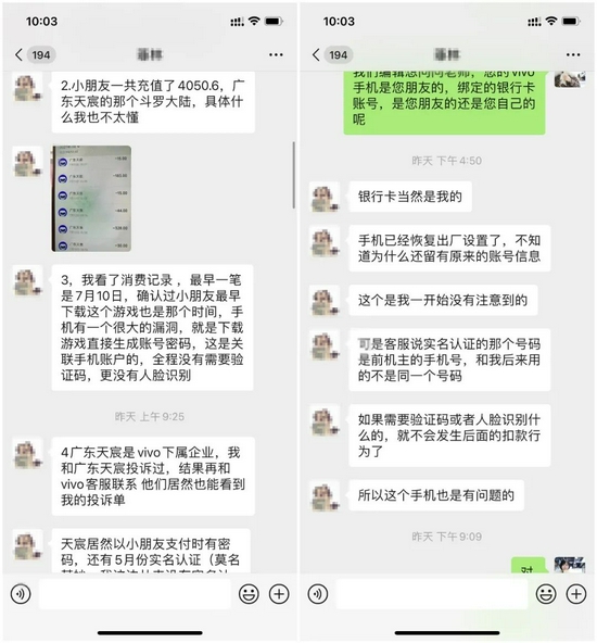 9月13日,“菲林”向“极点商业”反馈称,今年7月她给放暑假孩子一个二手vivo手机,意想不到的是,10岁孩子在vivo手机游戏商城下载了一款名为“斗罗大陆”的手游,十多天内,在没有实名认证、人脸识别认证情况下,一共充值消费4050.6元。