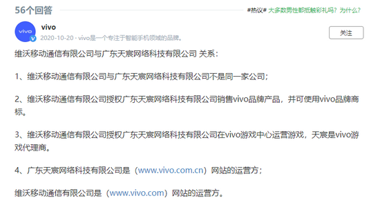 根据vivo官方认证号在百度知道的回复,维沃移动通信有限公司(vivo)授权广东天宸销售vivo品牌产品,并可使用vivo品牌商标。授权广东天宸在vivo游戏中心运营游戏,天宸是vivo游戏代理商。同时,广东天宸是(vivo.com.cn)官方网站运营方。