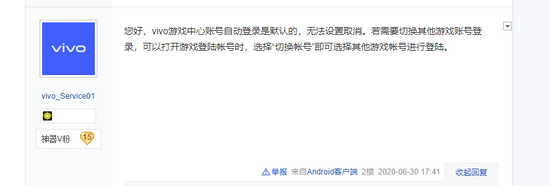 对这一点,“vivo_Service01”曾在2020年6月30日,回复网友“如何取消vivo游戏中心账号自动登录”问题时明确表示:vivo游戏中心账号自动登录是默认的,无法设置取消。“vivo_Service01”为vivo贴吧官方客服,目前发帖16.7万,都是与vivo相关内容。