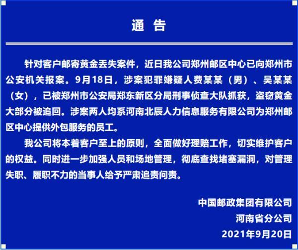 9月20日晚间,中国邮政集团有限公司河南省分公司发布通告称,针对客户邮寄黄金丢失案件,近日我公司郑州邮区中心已向郑州市公安机关报案。9月18日,涉案犯罪嫌疑人费某某(男)、吴某某(女),已被郑州市公安局郑东新区分局刑事侦查大队抓获,盗窃黄金大部分被追回。涉案两人均系河南北辰人力信息服务有限公司为郑州邮区中心提供外包服务的员工。我公司将本着客户至上的原则,全面做好理赔工作,切实维护客户的权益。同时进一步加强人员和场地管理,彻底查找堵塞漏洞,对管理失职、履职不力的当事人给予严肃追责问责。