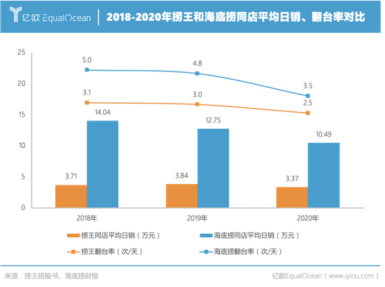 2018-2020年,海底捞的翻台率分别为5.0次/天、4.8次/天、3.5次/天,同期捞王的翻台率分别只有3.1次/天、3.0次/天、2.5次/天。