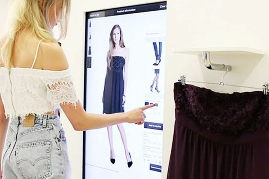 在试衣间里有一个大的触摸屏,顾客可以在上面直接挑选款式、尺码。此外,这个系统还可以根据顾客已经选择的服装,推荐搭配款式。