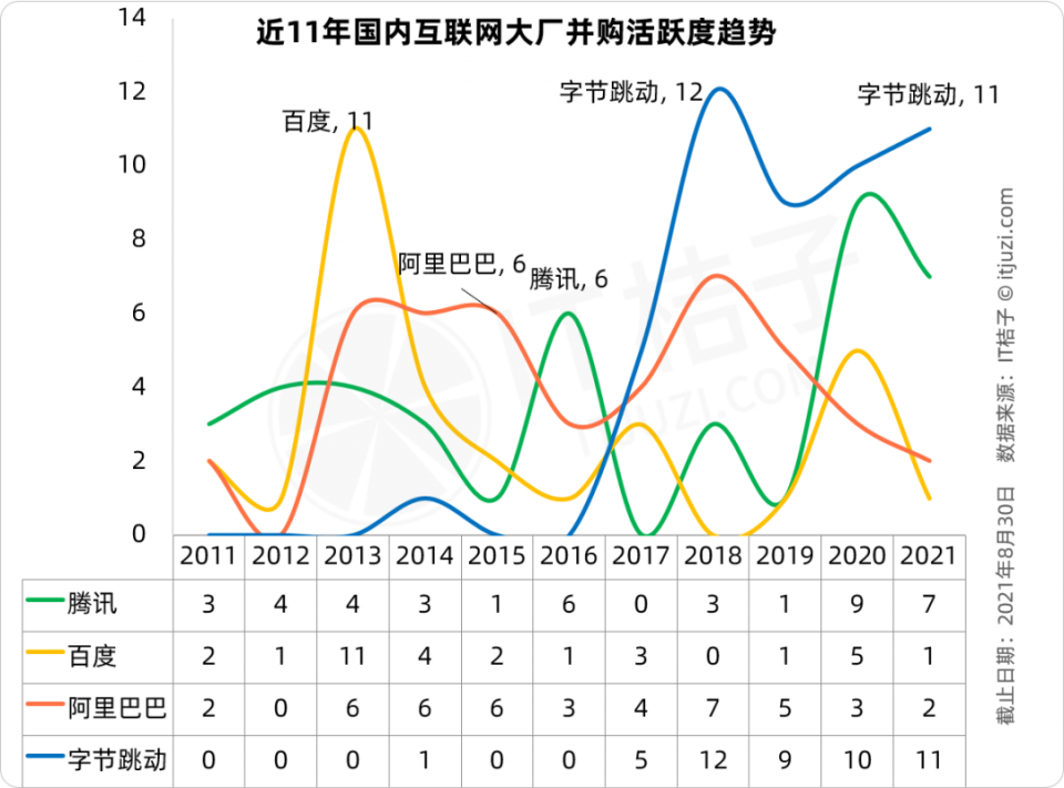 阿里巴巴、腾讯、百度、字节跳动稳稳的保持在第一梯队。那么这几家在历年的并购情况如何?是否有着显著的变化和趋势?