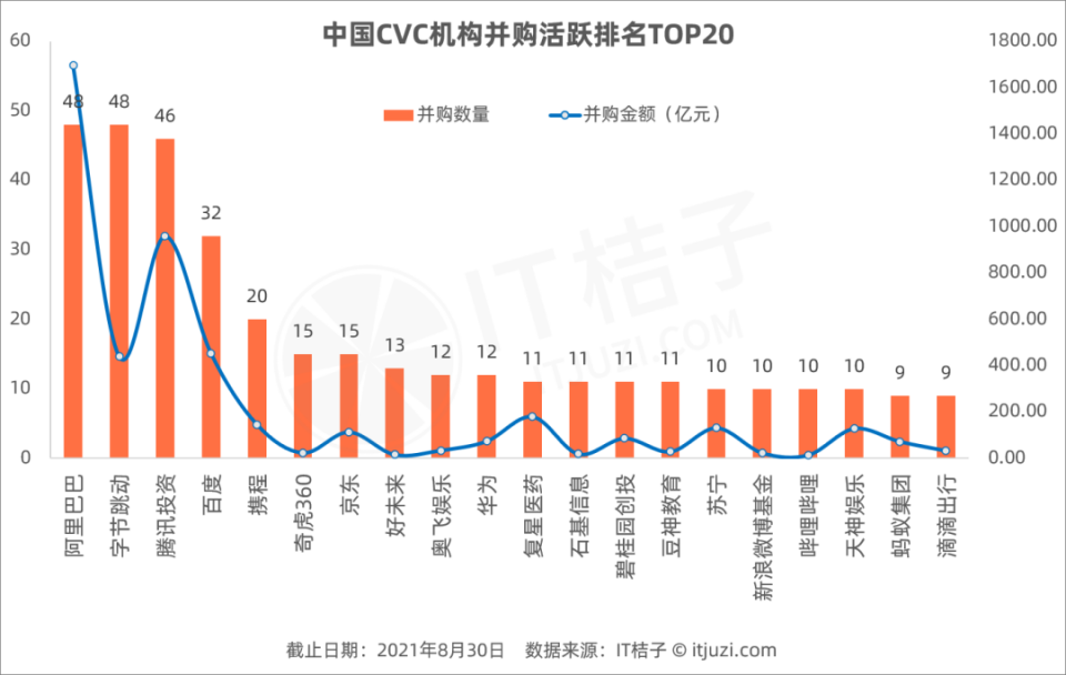 根据 IT 桔子 统计,截止到 2021 年 8 月,中国 CVC 并购方的前三名为阿里巴巴、字节跳动和腾讯,这几家公司历年来收购的公司在 46-48 家。之后较为活跃的还有百度、携程、奇虎 360、京东等等。排名前 20 的 CVC 并购方绝大多数为互联网巨头企业,少数为医药、地产、线下零售集团。