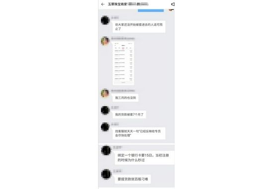 记者在“玩物得志”App上向官方客服咨询,在点击“提现什么时候到账”问题后,官方客服自动回复:“余额提现是1个工作日入账,货款提现是3个工作日入账,质保金是30个工作日到账,遇到周末和节假日会顺延到工作日。”但是通过平台内部商家群的聊天截图,记者注意到有一些商家3个月甚至7个月还未收到货款。