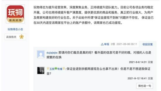 记者在“玩物得志”贴吧中,看到有商家关于保证金无法提取到账的投诉。对此,具有“玩物得志”标识的账号回应称“保证金已在30天内退至该商家在平台上的账户余额中,该商家也已成功提现。”