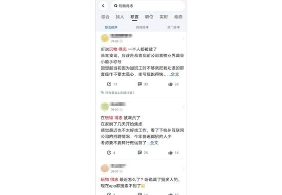 在某网络平台输入“玩物得志”公司名称,可以看到不少关于近期公司裁员的讨论。
