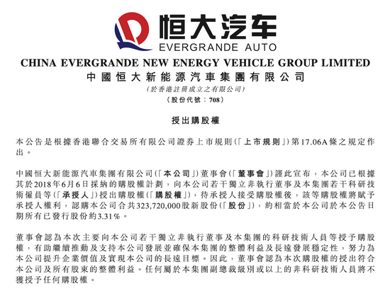 同时,消息人士告诉车东西,恒大汽车目前没有裁员,还希望员工留下继续工作。其中一种方式就是股权激励。9月21日,恒大汽车发出公告称,已向技术人员授出超过3.2亿股期权,占公司股本的3.31%,行权价为3.9港元,授予对象包括公司3名董事及集团约3180名雇员。