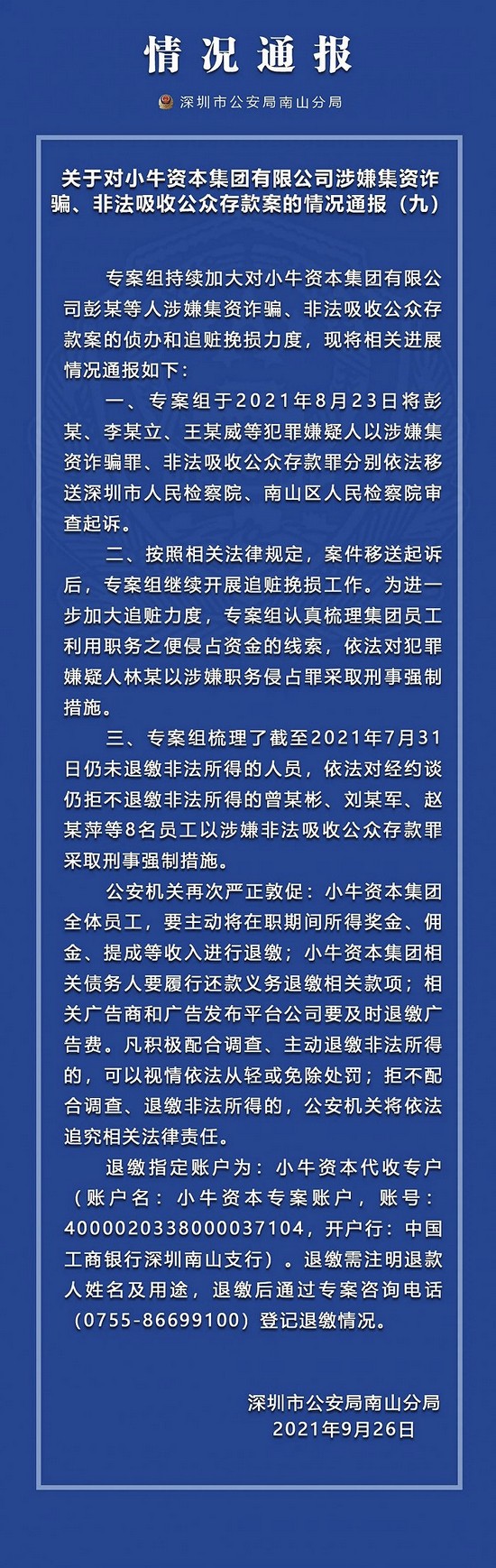 9月26日晚间,深圳市公安局南山分局官方微信公众号通报小牛资本集团有限公司涉嫌集资诈骗、非法吸收公众存款案相关进展。通报指出,多名犯罪嫌疑人以涉嫌集资诈骗罪、非法吸收公众存款罪分别依法移送深圳市人民检察院、南山区人民检察院审查起诉。具体来看: