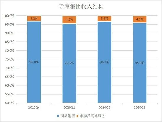身处越走越窄的奢侈品电商赛道,寺库也寻求过第二支柱项,表现却称不上差强人意。2015年后,寺库逐渐将业务范畴扩大为寺库商业、寺库金融、寺库智能、寺库社群等板块,但分析其近两年来的收入结构可知,奢侈品售卖贡献的收入从未低于95%,寺库的转型属于传说中的“转了个寂寞”,奢侈品电商的标签,寺库依旧顶在头上。