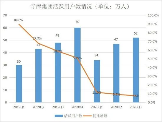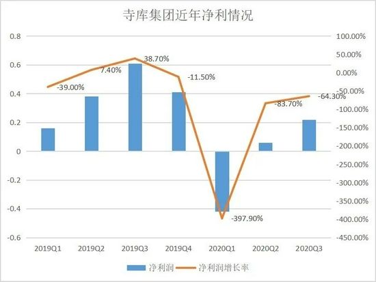 收入情况的表现也不尽如人意。财报显示,未受疫情影响的2019年,寺库营业收入增速已经出现下滑趋势,从年初的46.5%一路收窄至年末的13.8%。整理历年数据会发现,寺库营收增长率连续走低,2020年Q3入账13.73亿元,同比减少29.3%。截至2020年9月31日,寺库年度总营收为36.85亿元,仅为2019年总营收的53.8%。