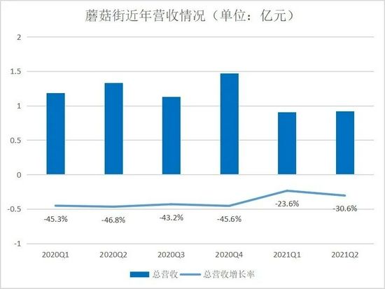 参照财报数据,蘑菇街的营收大跳水反映在2020财年,究其原因,2019年开始采取的“ALL IN 直播”战略有着不小责任。财报显示,2017、2018、2019财年,蘑菇街分别实现营收11.1亿元、9.73亿元、10.74亿元。当时间来到2021财年,蘑菇街营收为4.82亿元,同比下降42.28%,营业收入的负增长更是持续已久。