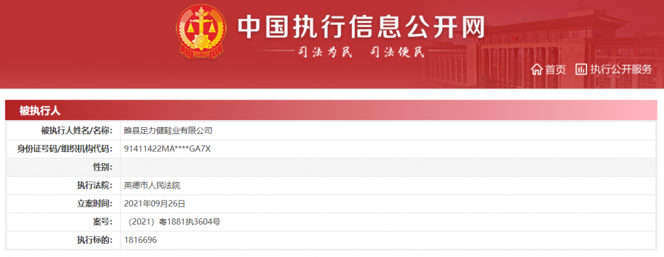 商业 足力健被强制执行超181万元 2021-09-28 22:07:41 分享 来源:界面新闻据中国执行信息公开网消息,近日,睢县足力健鞋业有限公司新增一则被执行人信息,案号(2021)粤1881执3604号,执行标的1816696元,执行法院为英德市人民法院。睢县足力健鞋业有限公司成立于2017年12月,法定代表人张京康,注册资本1亿人民币。股东信息显示,该公司由张京康、辛俊兰共同持股。值得一提的是,此前,该公司曾因买卖合同纠纷被莆田市中级人民法院恢复执行27975496元。