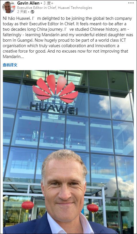 28日,艾伦在领英写道:“你好,华为,很高兴今天能加入这家全球科技公司担任执行主编。在经历了20年漫长的中国之旅后,感觉这一切都是命中注定。我学过中国历史,目前正在断断续续地学习普通话,我的大女儿在广西出生。现在,作为一家世界级的信息技术公司的一员,我感到非常自豪。华为是真正重视合作和创新的公司,这是一种永远的创造力。现在我没有借口不提高自己的普通话了...”