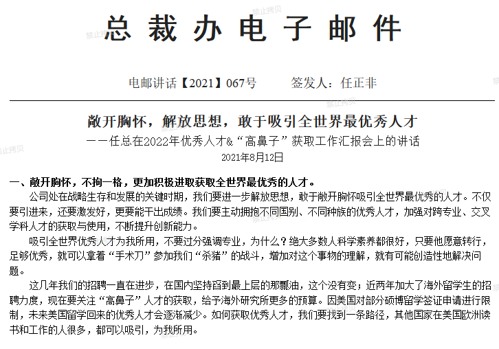 任正非在这次会上强调,除了继续招聘国内优秀人才(包括天才少年)的基础上,要加大海外留学生和“高鼻子”人才的招聘力度,其他国家在欧美读书和工作的人才也在考虑范围之内。