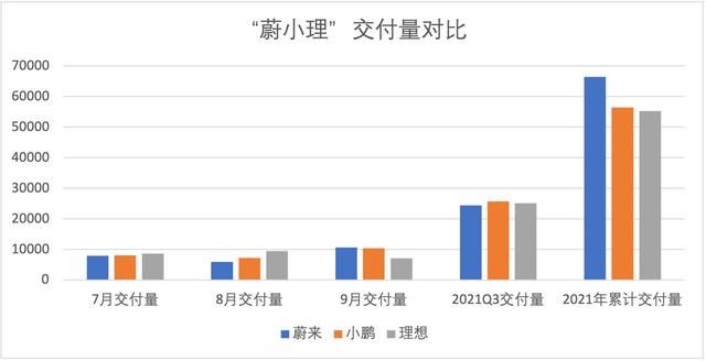 从2021年前三个季度的累计交付量来看,蔚来仍以较大优势领跑“蔚小理”。其中,蔚来汽车累计交付66395辆,小鹏汽车累计交付56404辆,理想汽车累计交付55270辆。