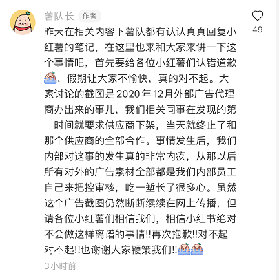商业 小红书就不尊重女性广告道歉:供应商不当操作 2021-10-03 08:52:20 分享 来源:界面新闻10月2日消息,近日,小红书在部分社交平台投放的广告引发争议,有用户认为这一投放内容涉嫌不尊重女性。对此,小红书官方账号在部分反映问题的笔记下致歉,并表示该广告是2020年12月外部广告代理供应商的一次不当操作,第一时间已发现问题,即刻下架广告,并终止与该供应商的全部合作。